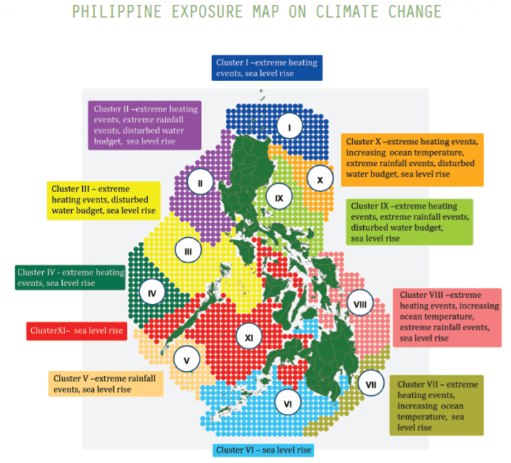 A report by the Philippine Department of Environment and Natural Resources shows how different areas in the Philippines will be challenged with a range of climate threats, based on where they are located.